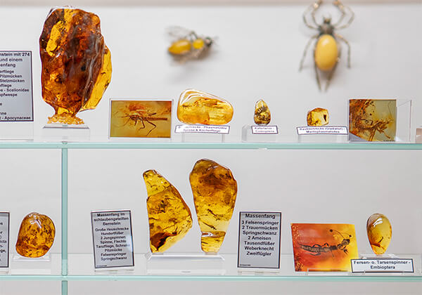 Über 400 Ausstellungsstücke zeigen Farbvariationen und Fundorte des Bernsteins. Einen Großteil der Sammlung nimmt die einmalige Inklusenschau ein, wo tierische und pflanzliche Einschlüsse gezeigt werden.