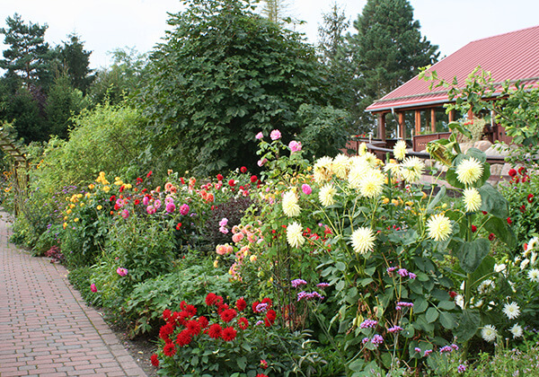 Die Blütenpracht der Rosen und Stauden auf 1.500 m². Der Blütenduft lockt bei Schönwetter im Hochsommer bis zu 2.000 Schmetterlinge an, die auf den Blütenköpfen beobachtet werden können
